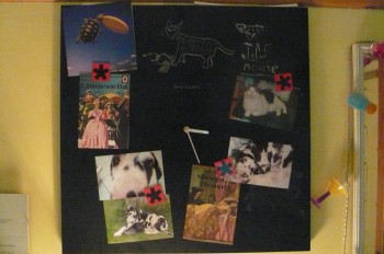 This is Erin’s new hat. My Mum recently went on a trip to Marrakech, and she bought this for him in one of the markets there. That’s how cool my Mum is – when she goes on holiday she brings back presents for me, and for my skeleton. And it was perfect timing too because Erin was becoming bored with his Victorian top hat, and had taken to trying to put it on the Siamese, which she dislikes. And an unhappy Siamese makes for an unhappy human. Now, because of the hat, we are all happy, and living together in harmony once again. Soon, Erin will own more hats than I do. I spoil my skeleton almost as much as I spoil my Great Dane. Moose has a hat too. Here she is wearing it on her birthday: